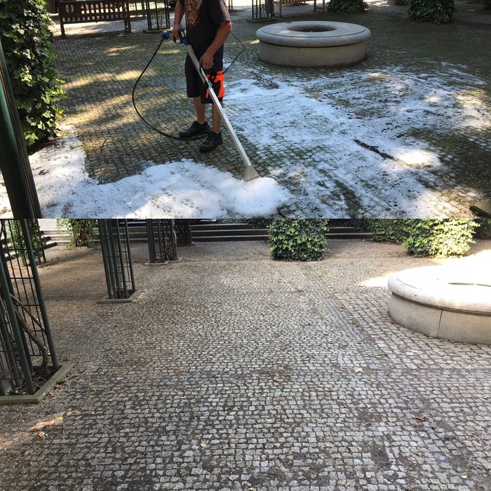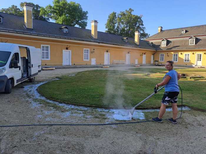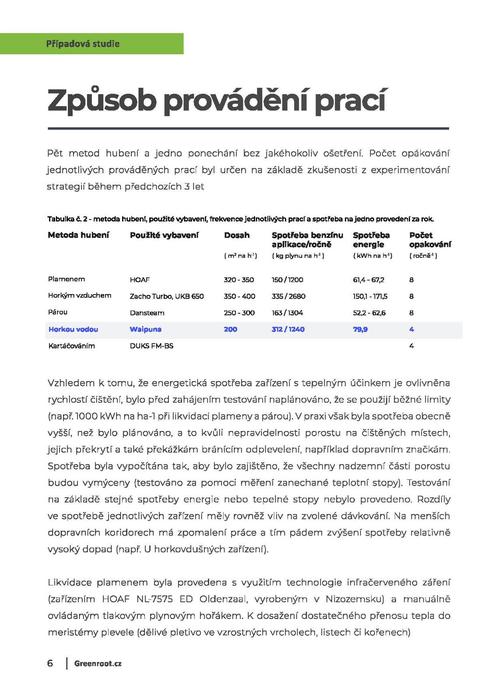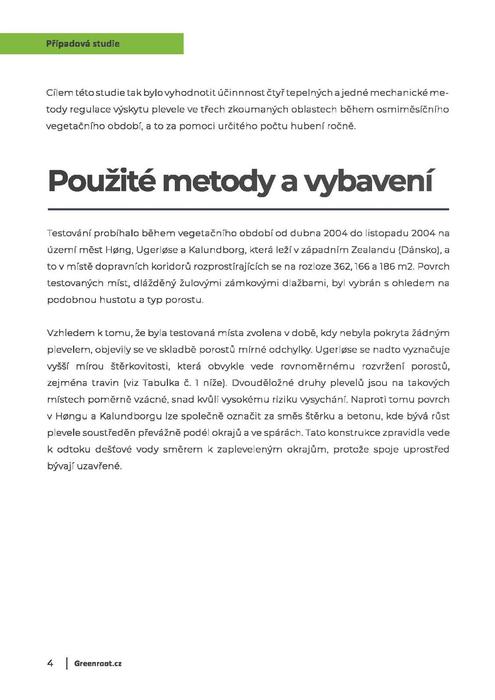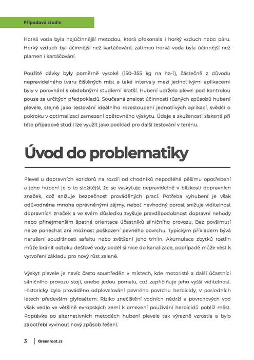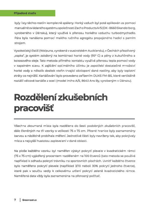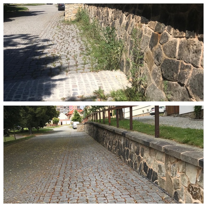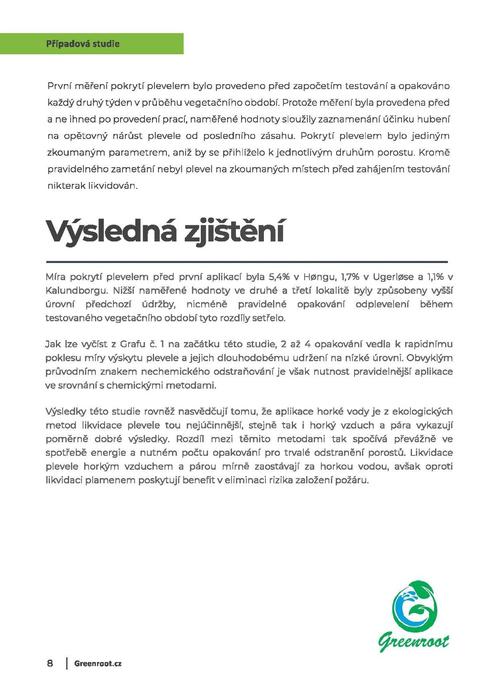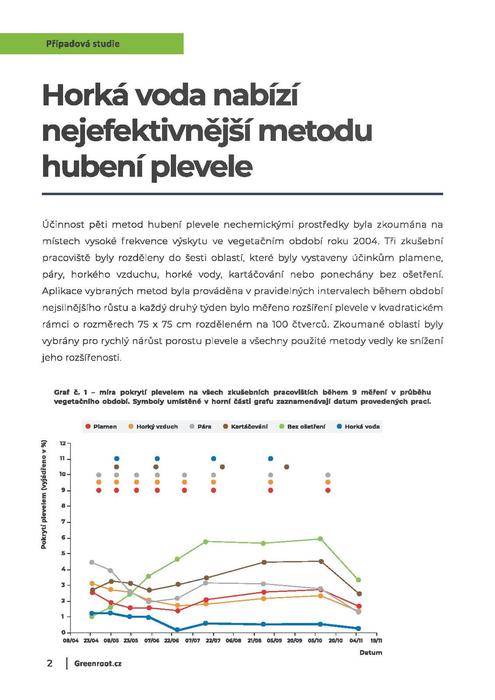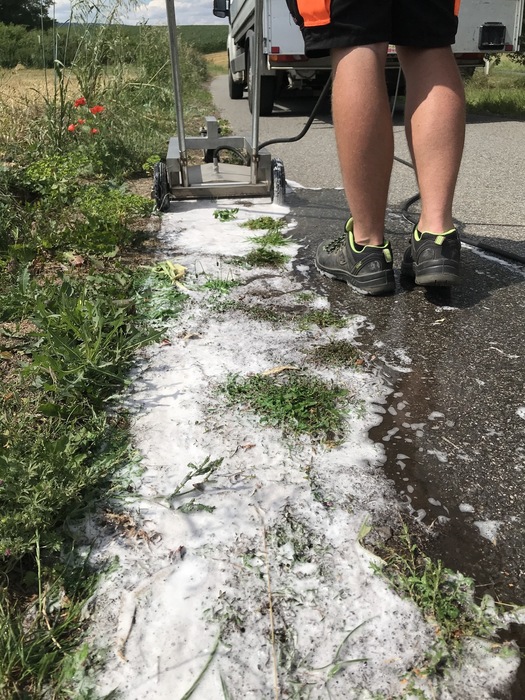 Pěnou o teplotě zhruba 90 stupňů za pomoci speciálních aplikátorů likvidujeme plevel ve městech a obcích. Nepoužíváme žádnou chemii, pouze kombinujeme ekologické metody hubení. Nežádoucí rostliny odstraňujeme podél obrubníků i z dlažby. Poradíme si také s vysokým plevelem. V rámci ekologické likvidace plevele kombinujeme, díky speciálnímu vysokotlakému stroji a různým doplňkovým nástrojům, techniku využívající vroucí vody a pěny o teplotě až 90 °C a zároveň i horké páry, která vzniká v uzavřeném aplikátoru. Vzniklá pěna je 100 % rostlinného původu. Obsahuje jen kukuřičný škrob a cukr. Během několika málo minut zmizí.