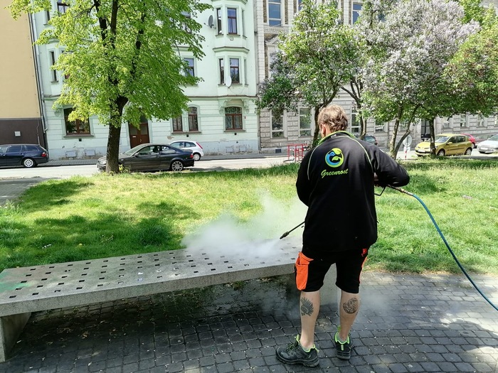 - Wir reinigen die Bank erneut und desinfizieren sie mit niedrigerem Wasserdruck